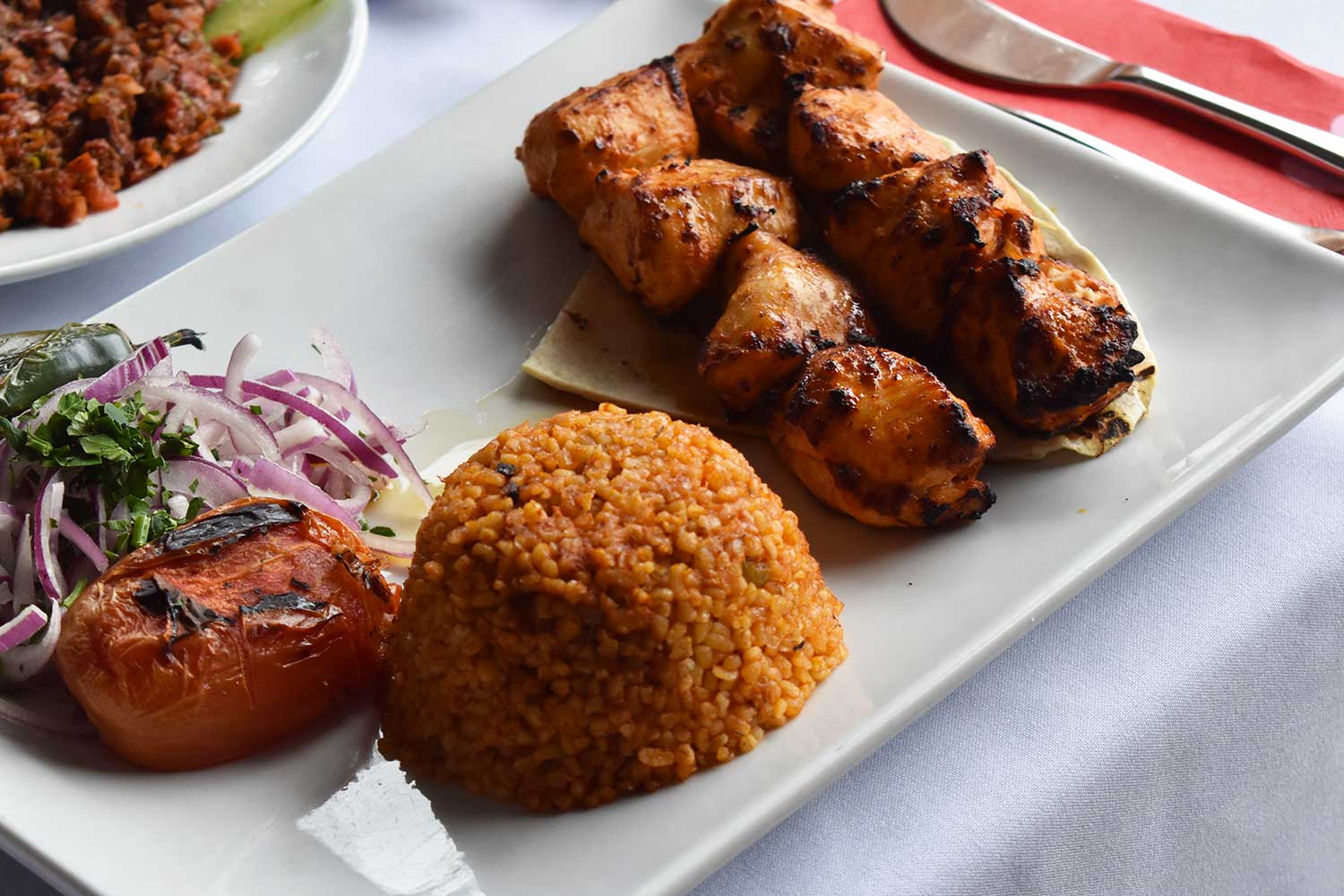 Skewered charcoal broiled tender cubes of lamb, lettuce, onions and tomatoes.